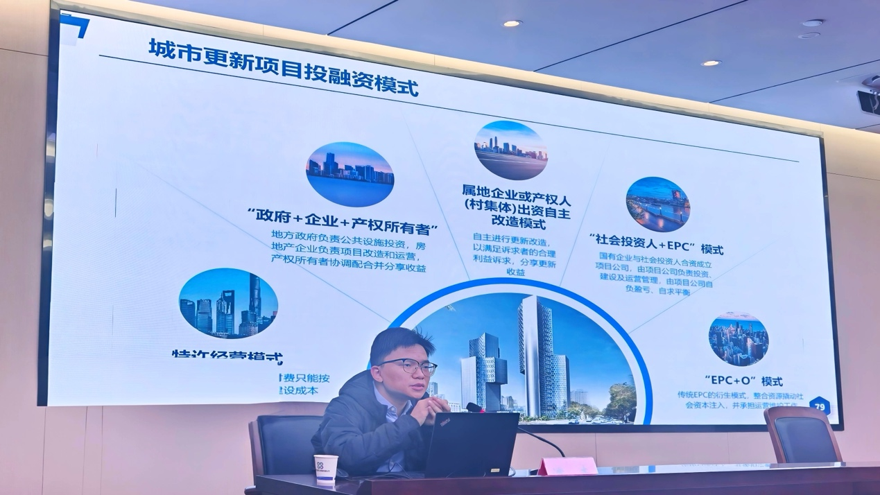 潘杰以城市更新政策導(dǎo)向作引,對現(xiàn)階段城市更新主要任務(wù)進行深入淺出的介紹,并結(jié)合地方城市更新工作要點,為與會人員詳細介紹了各類上級資金與城市更新項目的適配性。并結(jié)合以舊換新實施案例,對城市更新工作推進方向及推進重點抽絲剝繭,幫助與會人員更好理解城市更新項目實施要點。